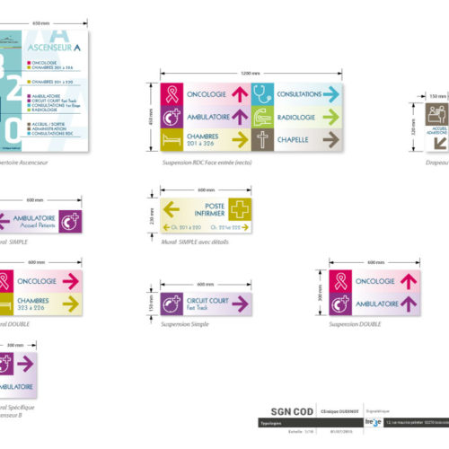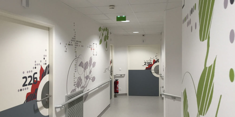 L’univers médical impose l’efficacité et la rigueur. La signalétique doit être immédiatement identifiable et compréhensible par tous. Des lettres claires et simples, des couleurs à la signification intuitive et cohérente. Mais l’univers médical vise également à accompagner des patients et leur famille avec autant de sérénité et de respect que possible. Par des formes lentes, des courbes légères, des teintes douces. Inconsciemment, cela nous rassure. Ici, on prend soin de nous, nous sommes en de bonnes mains.